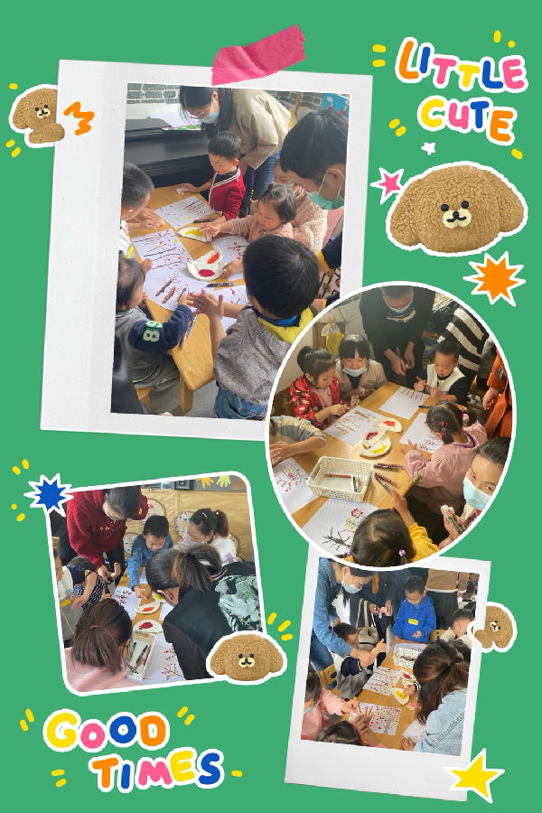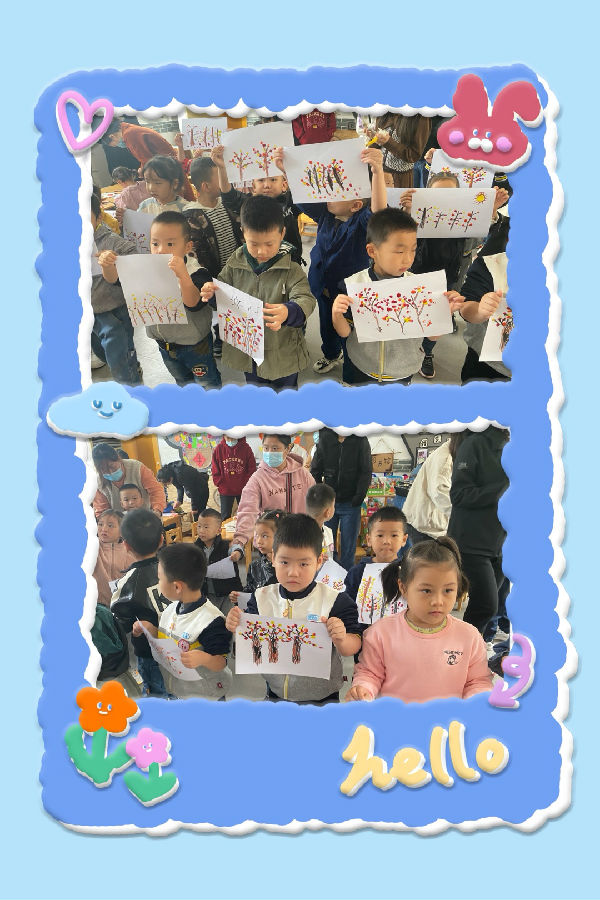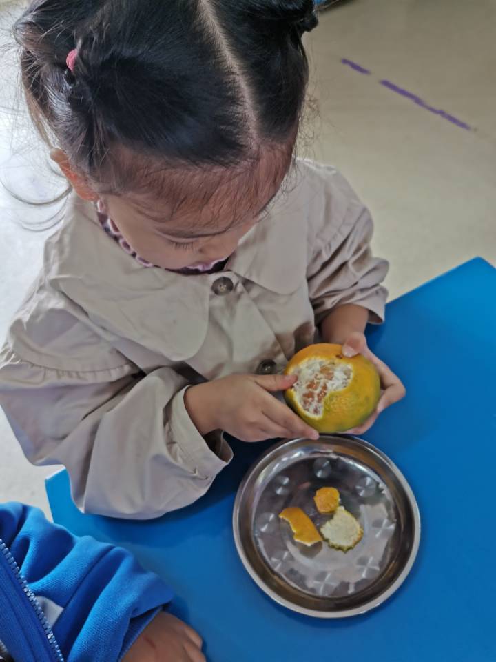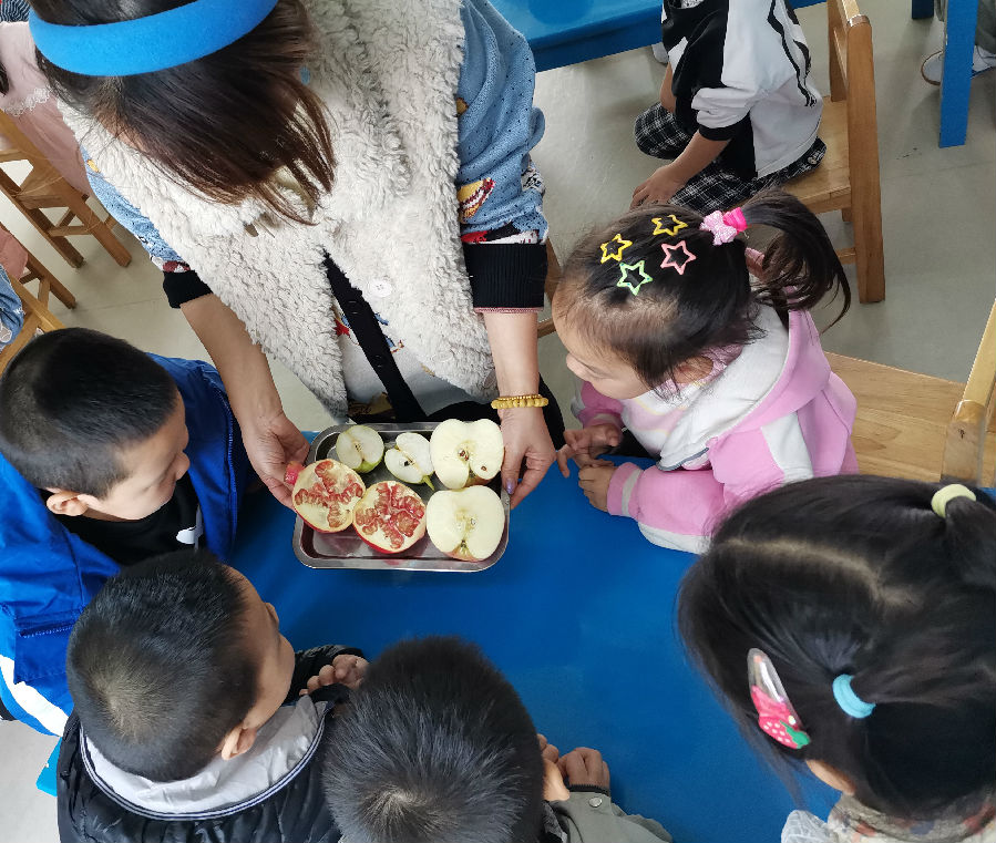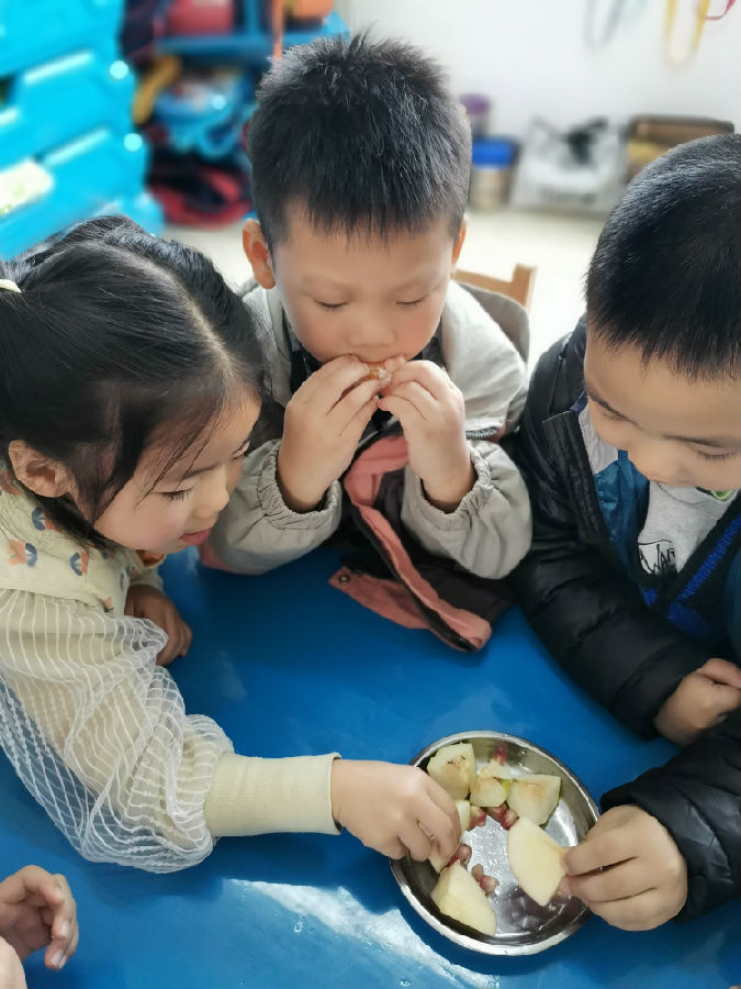 活动中,孩子们一起收集了不同的秋天果实,有的带来了红彤彤的苹果,有的带来了咧开了嘴的石榴,还有的还带来了黄橙橙的桔子。活动中,孩子们摸一摸、闻一闻、尝一尝,充分了解这些秋天果实的形状、颜色、味道等。孩子们在品尝这些美味的果实中,切身感受到了分享的愉快、丰收的喜悦。不仅如此,孩子们还进行了一系列的艺术创作。孩子看着自己的作品都露出了满意的笑容,在活动中孩子们不仅了解、掌握了秋天的特征,同时也在活动中找到了乐趣。