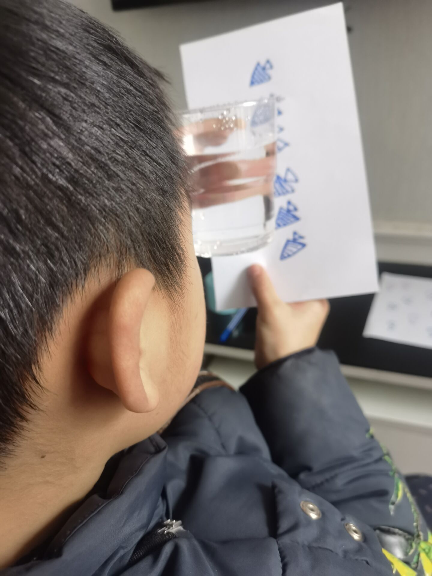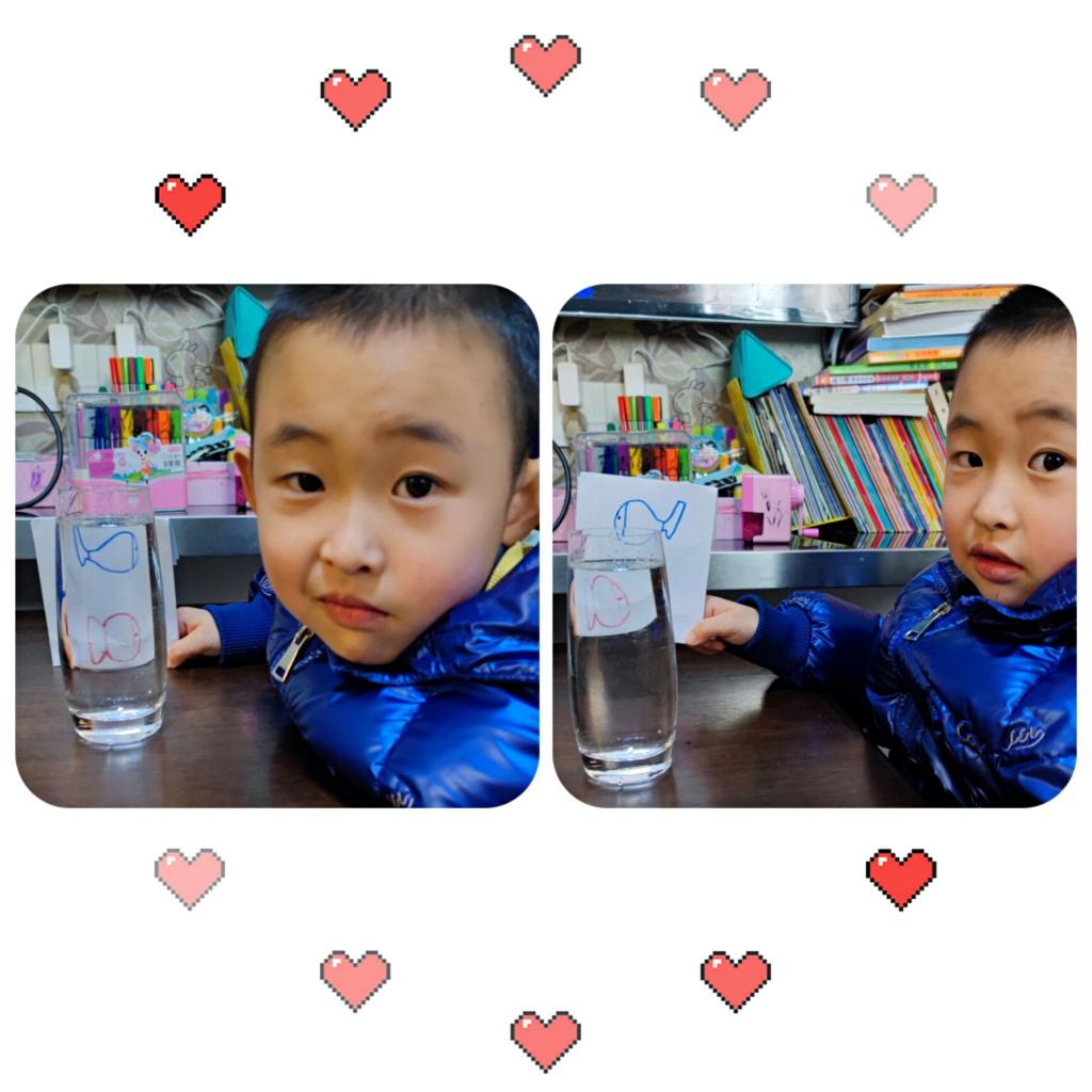 那就先准备好实验用品:一张白纸、水彩笔、一个透明水杯,准备好了,那就让我们开始实验吧。首先,请在白纸上画两条小鱼,在提前准备好的杯子中加入水,放到小鱼的面前,小鱼会有怎样的变化呢?哇,小鱼居然变换了方向,这也太神奇了吧!原来装满水的杯子就像一个凸透镜,小鱼在凸透镜中形成了反转的虚线。相信大家通过科学小实验都探索出凸透镜的奥妙了吧!