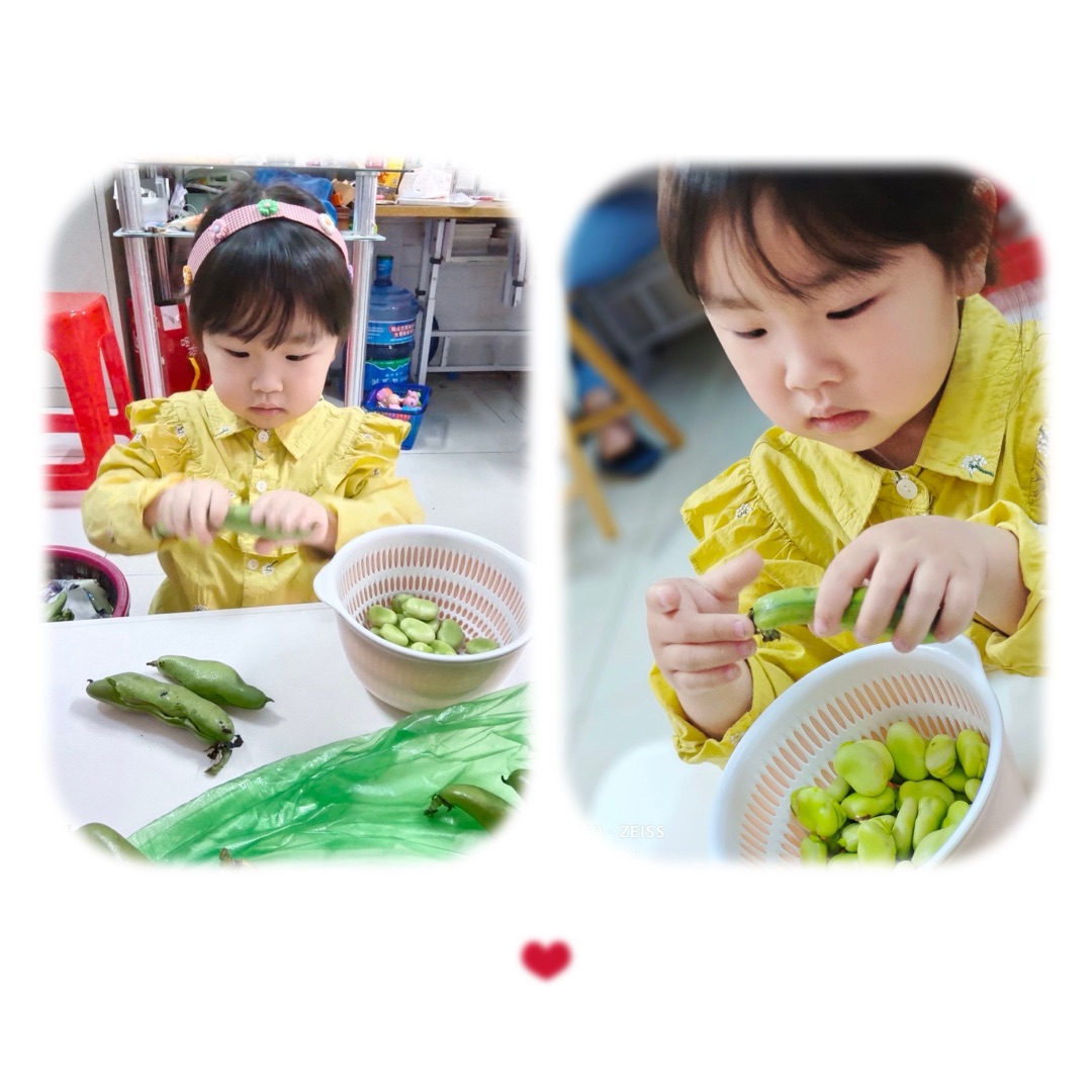 为了让幼儿在实践中体验生活,尝试自主发现、自主探索。近日,苏州市曹家巷幼儿园小一班的小朋友开展了“青青蚕豆轻轻剥”的实践活动。瞧!孩子们拿着蚕豆宝宝,左看看又看看,小手一捏——里面的豆子鼓鼓的,真饱满!接着,两只小手轻轻地将蚕豆一掰,豆壳就打开了,一颗颗蚕豆宝宝露出来啦,青青的、嫩嫩的,透着一股淡淡的豆子清香味,真想赶快尝一尝呀!不一会儿,满满一碗的蚕豆就剥好了。午饭时,孩子们吃着自己亲手剥的蚕豆,特别香!通过让孩子们“看、摸、闻、剥、尝”等形式,让孩子们体会到劳动的快乐。此次活动,充分体现了“大自然大社会”都是活教材的理念,让幼儿在游戏化、生活化的教育活动中的得到发展。