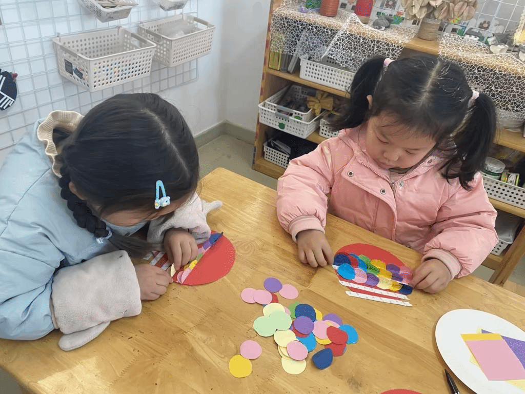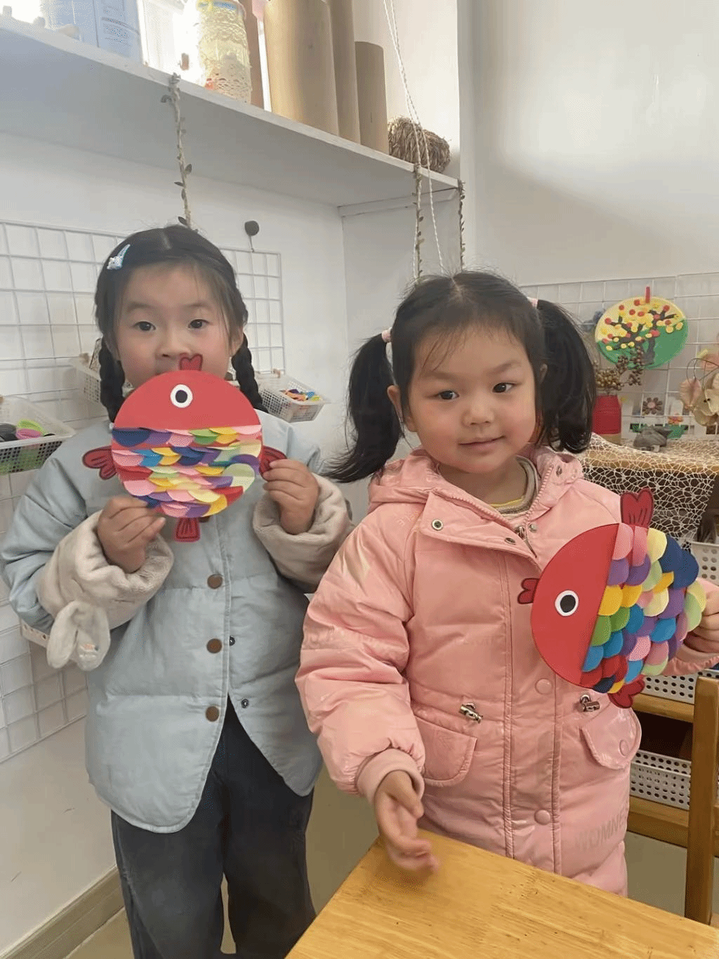 活动开始前,老师先给孩子们介绍制作材料并现场展示制作过程。之后孩子们大显身手:先在红纸上画出圆圆的鱼身、鱼嘴、鱼鳍和鱼尾,然后用五颜六色的圆形小彩纸小心翼翼地折叠鱼鳞并一层一层的粘贴到小鱼身上,最后用一根红线把小鱼挂起来……不一会儿,一个个活灵活现的小鱼就做好了。老师将小鱼悬挂在教室内,营造出“年年有鱼”的喜庆氛围,迎接农历新年的到来。本次活动,孩子们锻炼了动手能力,提高了审美认知,也感受到了春节即将来临的浓厚氛围和中华传统文化的博大精深。