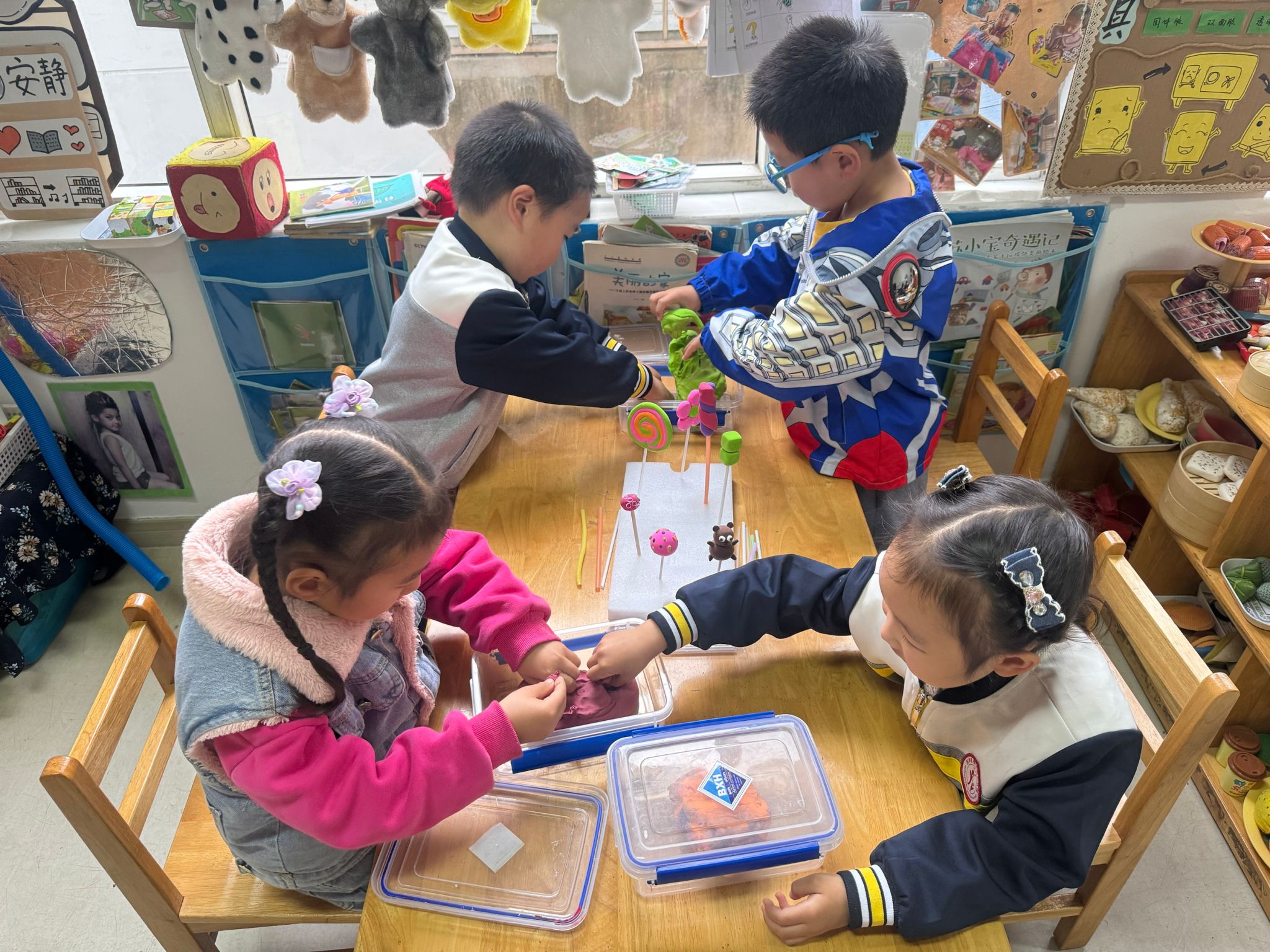 每个孩子都是高手,他们对粘土活动的喜爱程度不亚于任何一种玩具,它带给孩子们的快乐是无与伦比的。在五颜六色的粘土中运用揉、搓、捏、切等动作进行创作,一颗颗可爱的棒棒糖从孩子们灵巧的手中绽放,整个活动充满了欢乐、合作和畅想。他们玩得不亦乐乎,看着自己的创意和成果,孩子们得到了收获的快乐。